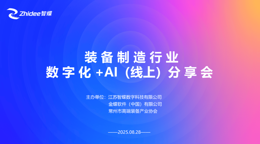 2025年8月28日,由江苏智蝶数字科技无限公司(以下简称“江苏智蝶”)、金蝶软件(中国)无限公司及常州市高端配备财产协会配合举办的“配备制制行业数字化+AI(线上)分享会”成功举办。