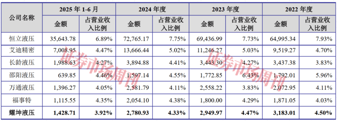 据中国工程机械工业协会出具的证明,2022年至2024年,耀坤液压出产的油箱和液压硬管产物正在中国工程机械市场拥有率均位居国内市场前三。 另据中国液压气动密封件工业协会出具的证明,公司分析实力正在液压行业位居前列,公司运营规模较大,具备行业代表性,2022年至2024年,年度行业产物停业收入正在液压行业沉点联系企业中排名前十。