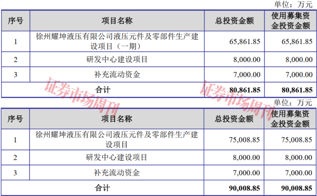 招股书(注册稿)披露,耀坤液压拟募集资金8。09亿元, 此中6。59亿元投向徐州耀 坤液压无限公司液压元件及零部件出产扶植项目(一期),8000万元投向研发核心扶植项目,7000万元用于弥补流动资金。 对比其2024年1月发布的上会稿,最新注册稿的募资总额及个体项目投资金额均有所调减。